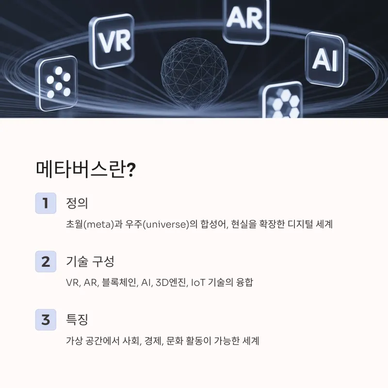 ‘메타버스(Metaverse)’는 초월(meta)와 우주(universe)의 합성어로, 현실 세계를 가상공간에 확장한 디지털 세계를 뜻합니다. 단순한 VR게임이 아닌, 가상 공간에서의 사회, 경제, 문화 활동이 가능한 세계입니다.